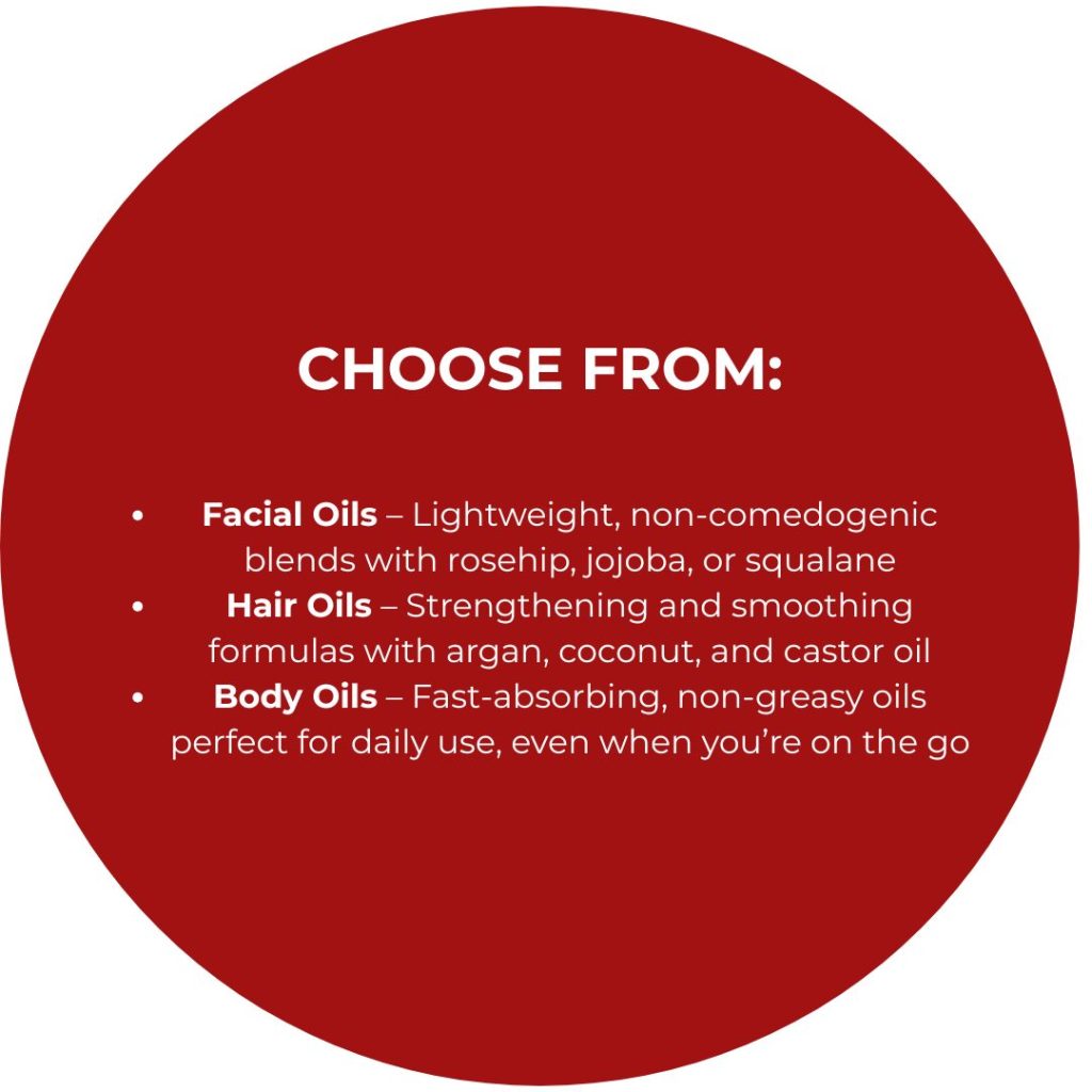 All our oils can be formulated as vegan, cruelty-free, fragrance-free, and made with 100% natural ingredients where possible. Whether you’re targeting skincare minimalists, wellness enthusiasts, or luxury spa customers, our oils deliver quality, performance, and versatility in every drop.