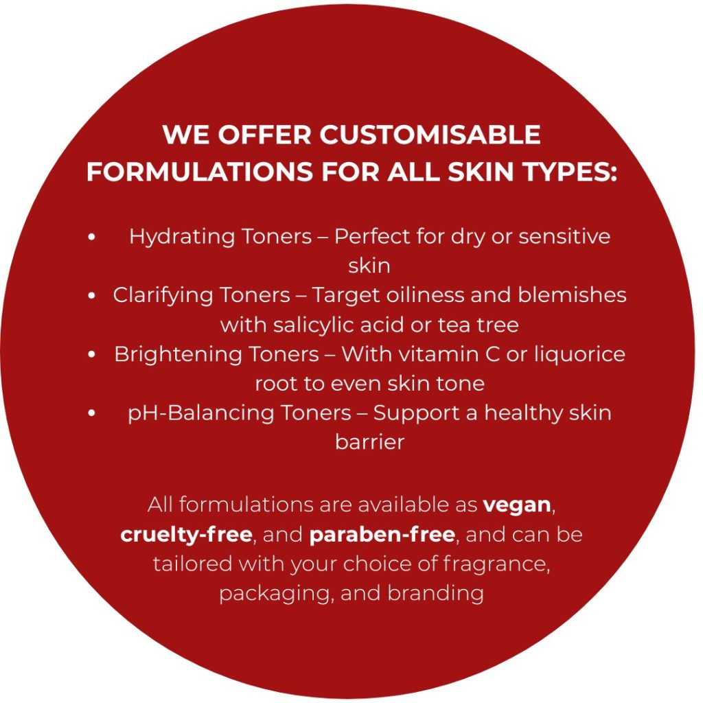 Our range of private label facial toners is designed to refresh, soothe, and rebalance the skin after cleansing—while enhancing the absorption of serums and moisturisers that follow. Crafted with naturally derived botanical extracts, hydrating ingredients like aloe vera and hyaluronic acid, and skin-loving actives such as witch hazel, rose water, or niacinamide, our toners are gentle yet effective.